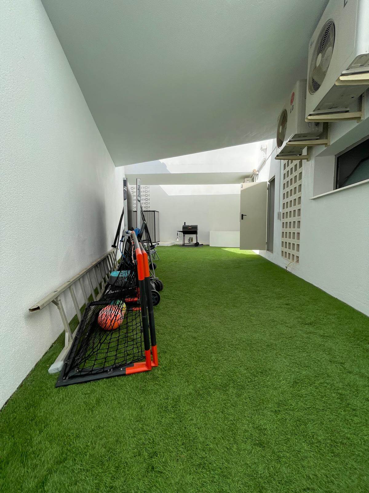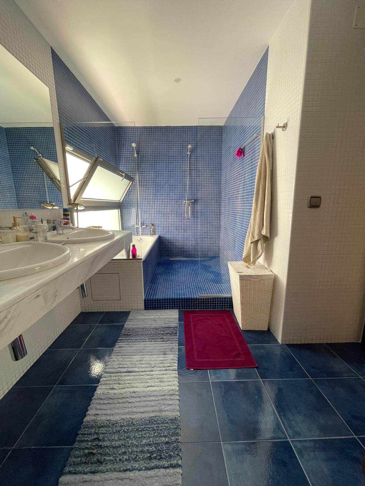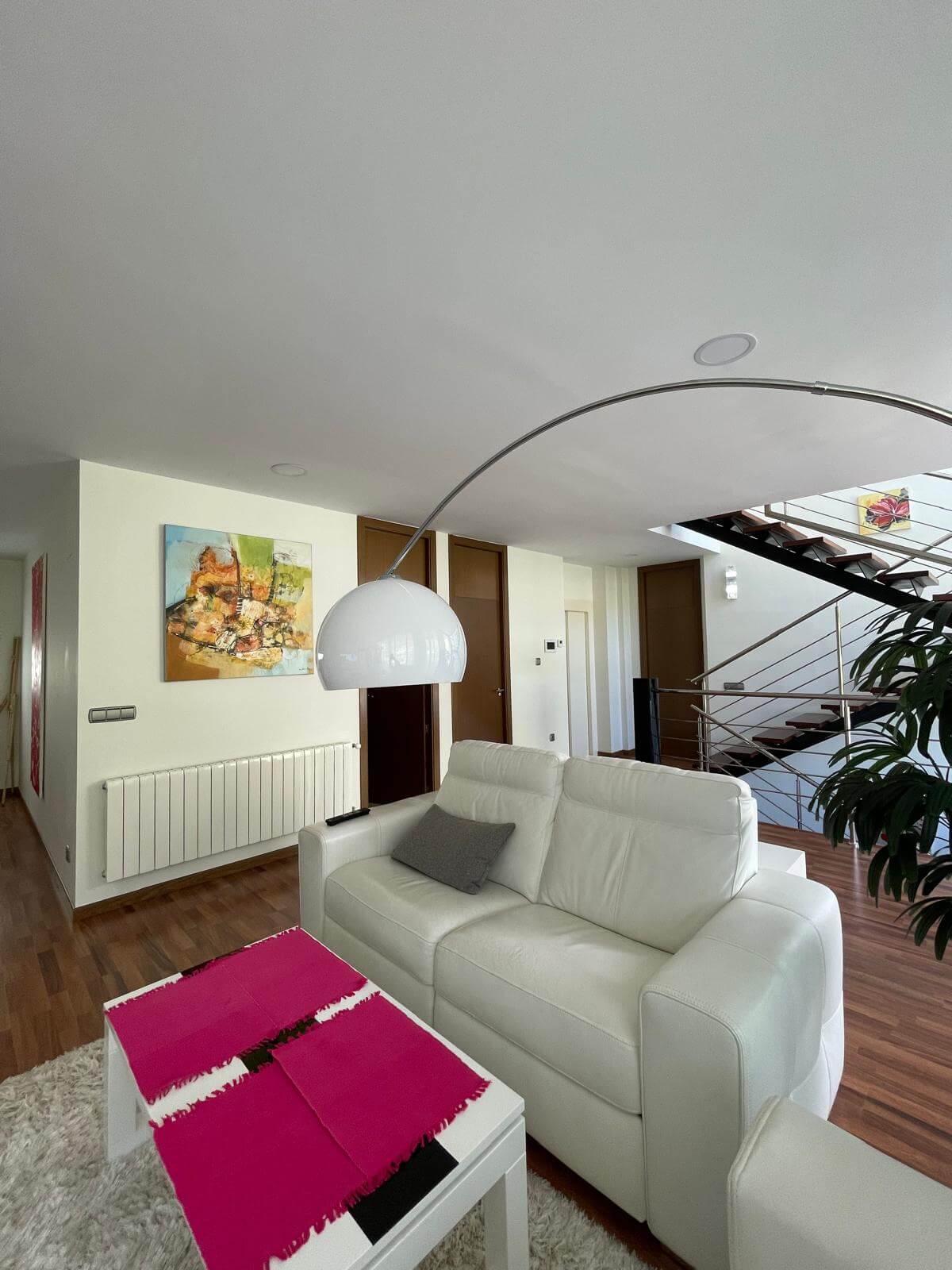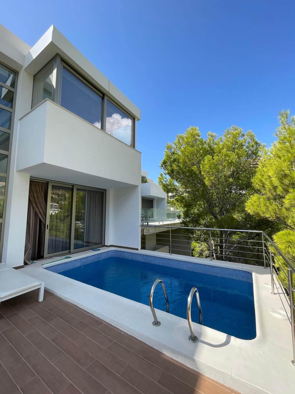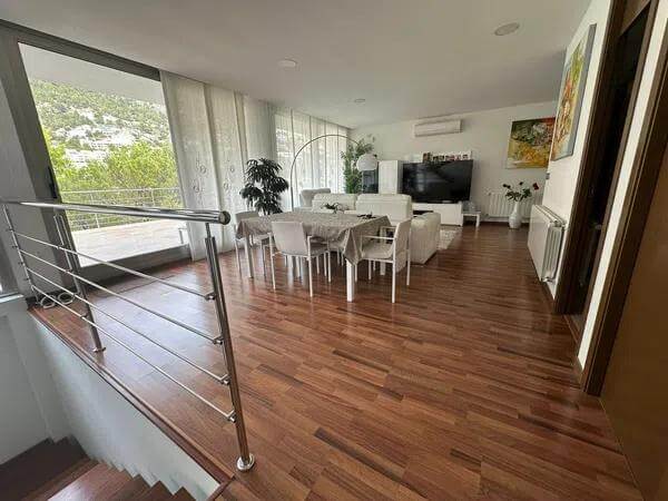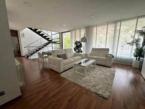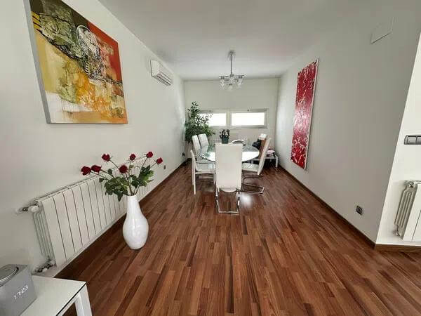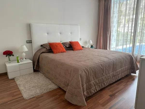 The ground floor features three additional bedrooms, two bathrooms, and fitted wardrobes, ensuring ample storage space. This villa is equipped with all modern comforts, including a lift, solar panels, and radiators, making it a perfect combination of style and sustainability.