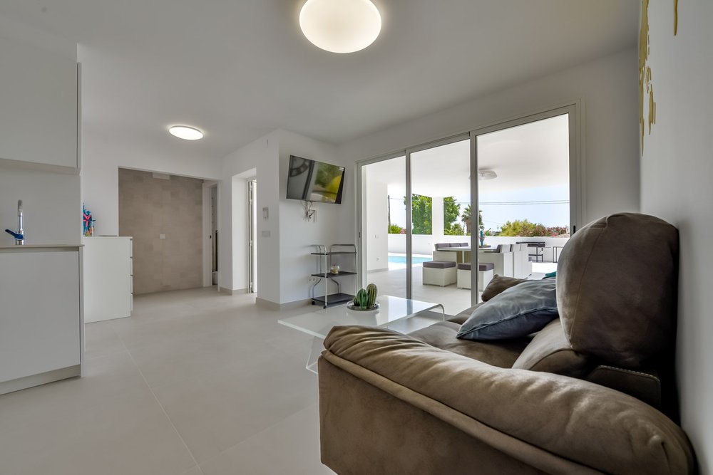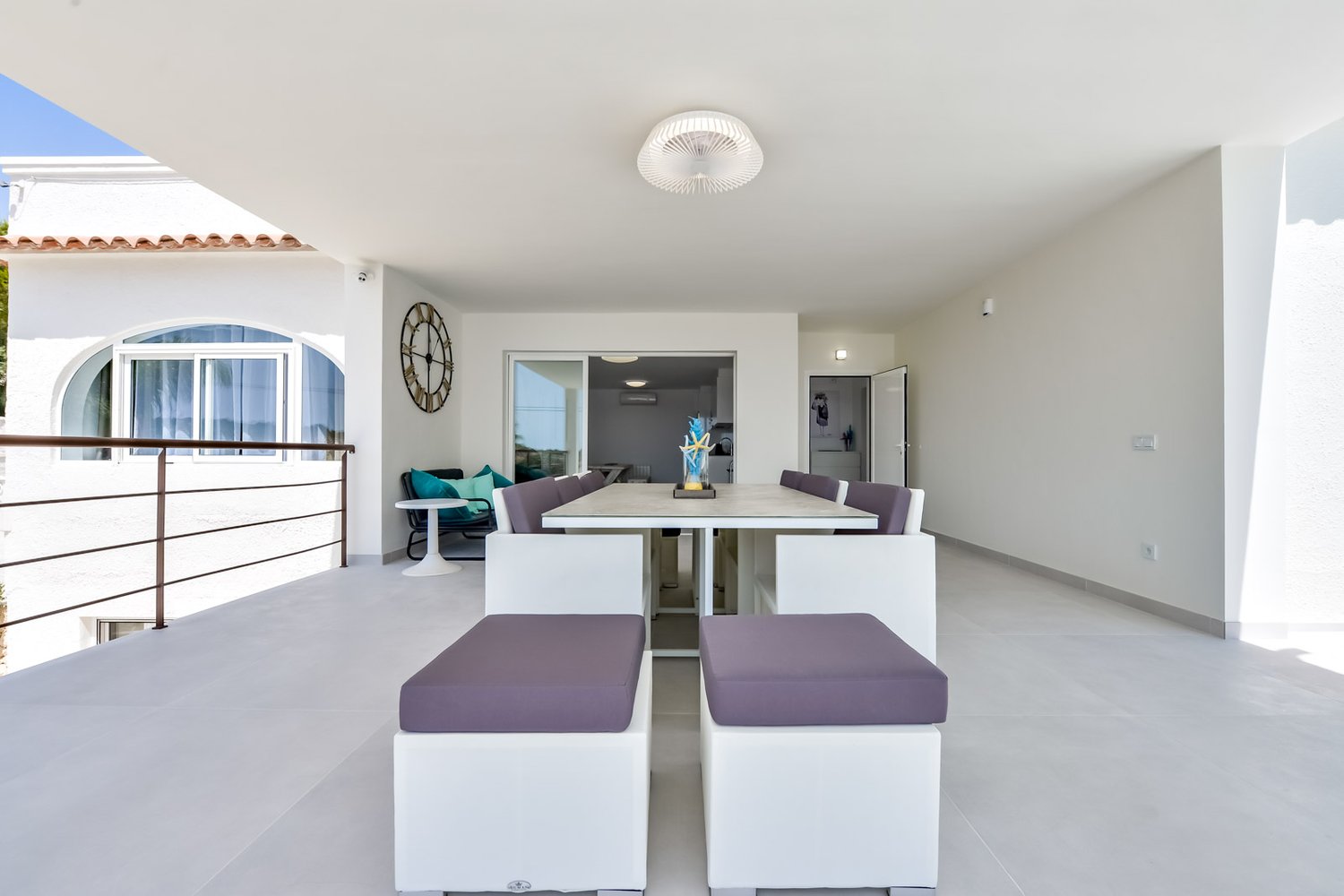 This beautifully renovated villa in Moraira offers a perfect blend of modern comfort and Mediterranean charm. Located just 1km from the town center and the picturesque La Ampolla beach, the property is fully furnished and ready to move in. The main house features a spacious and bright living room with large windows that open to a stunning terrace overlooking a serene pine forest, providing a peaceful and private atmosphere. The open-plan kitchen seamlessly connects to the living space, making it ideal for entertaining.