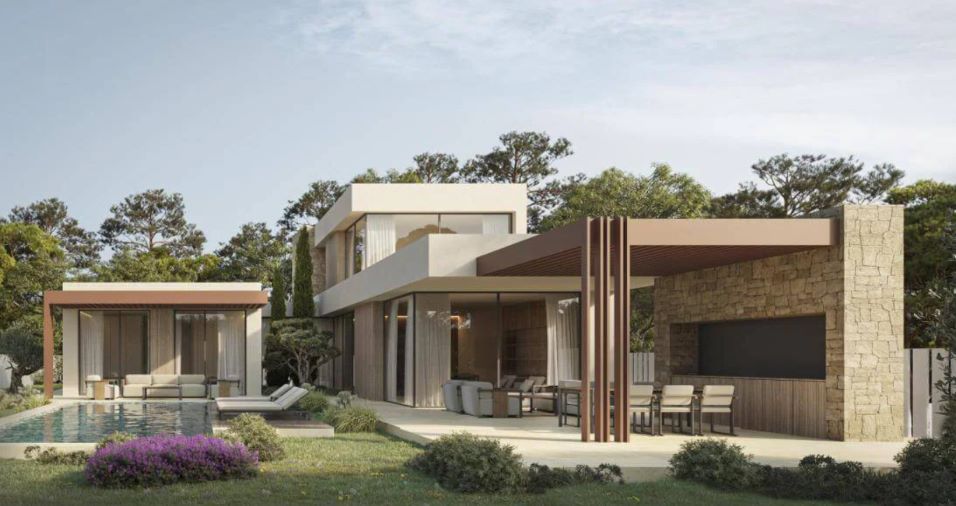Set on a 1,000 m² plot with 210.14 m² of built space, the property features elegant lines, large windows, and soft shapes that open onto a private swimming pool and a landscaped garden.