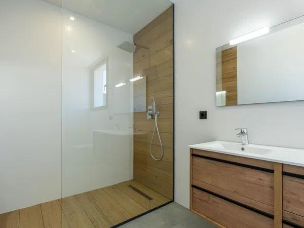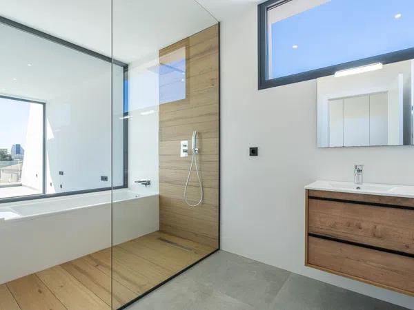 The upper floor comprises 3 bedrooms with en-suite bathrooms and access to a sunny terrace. The villa is equipped with underfloor heating, ducted air conditioning system and large format porcelain floor tiles. There is a covered parking space of 33,35m2.